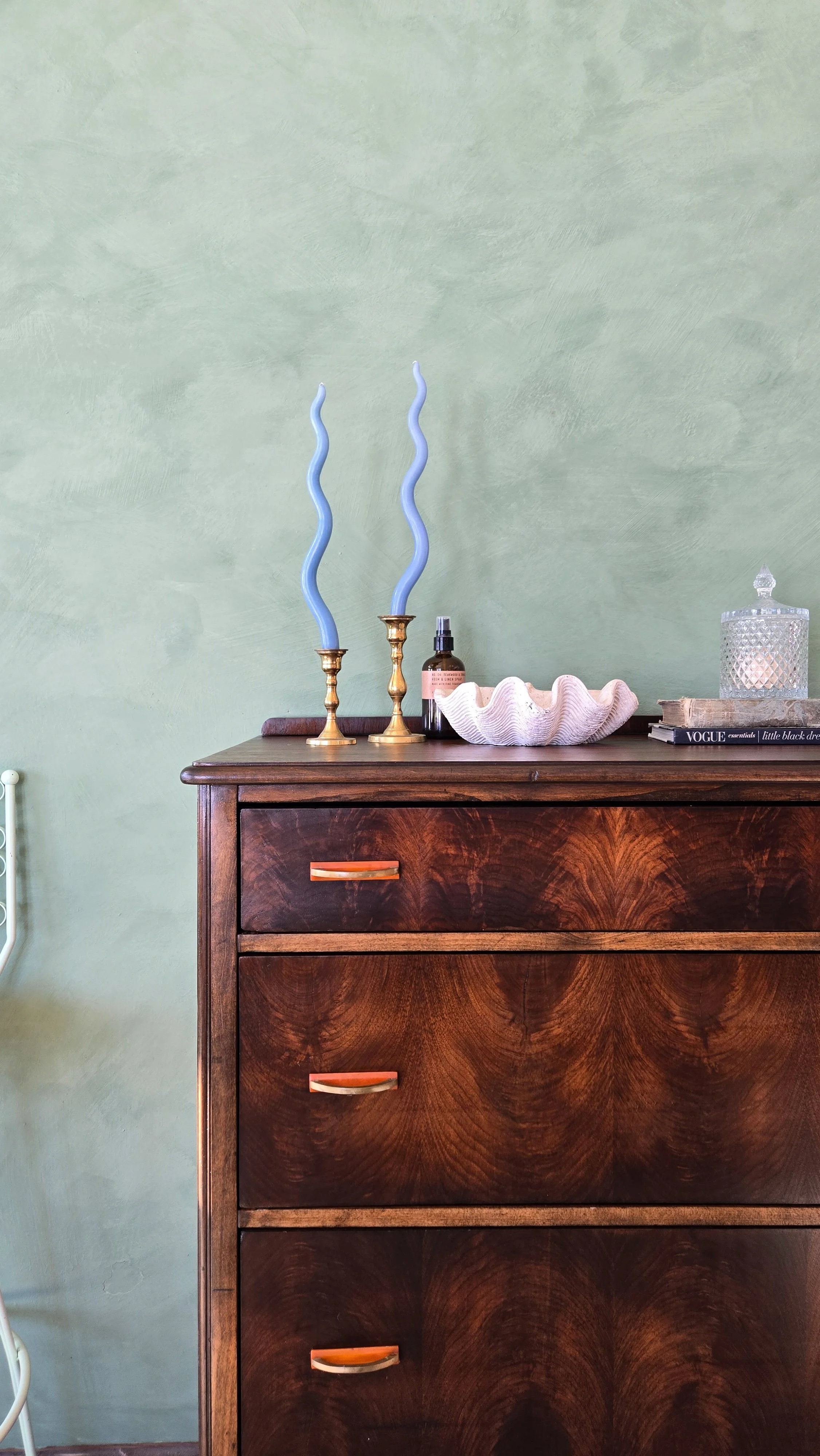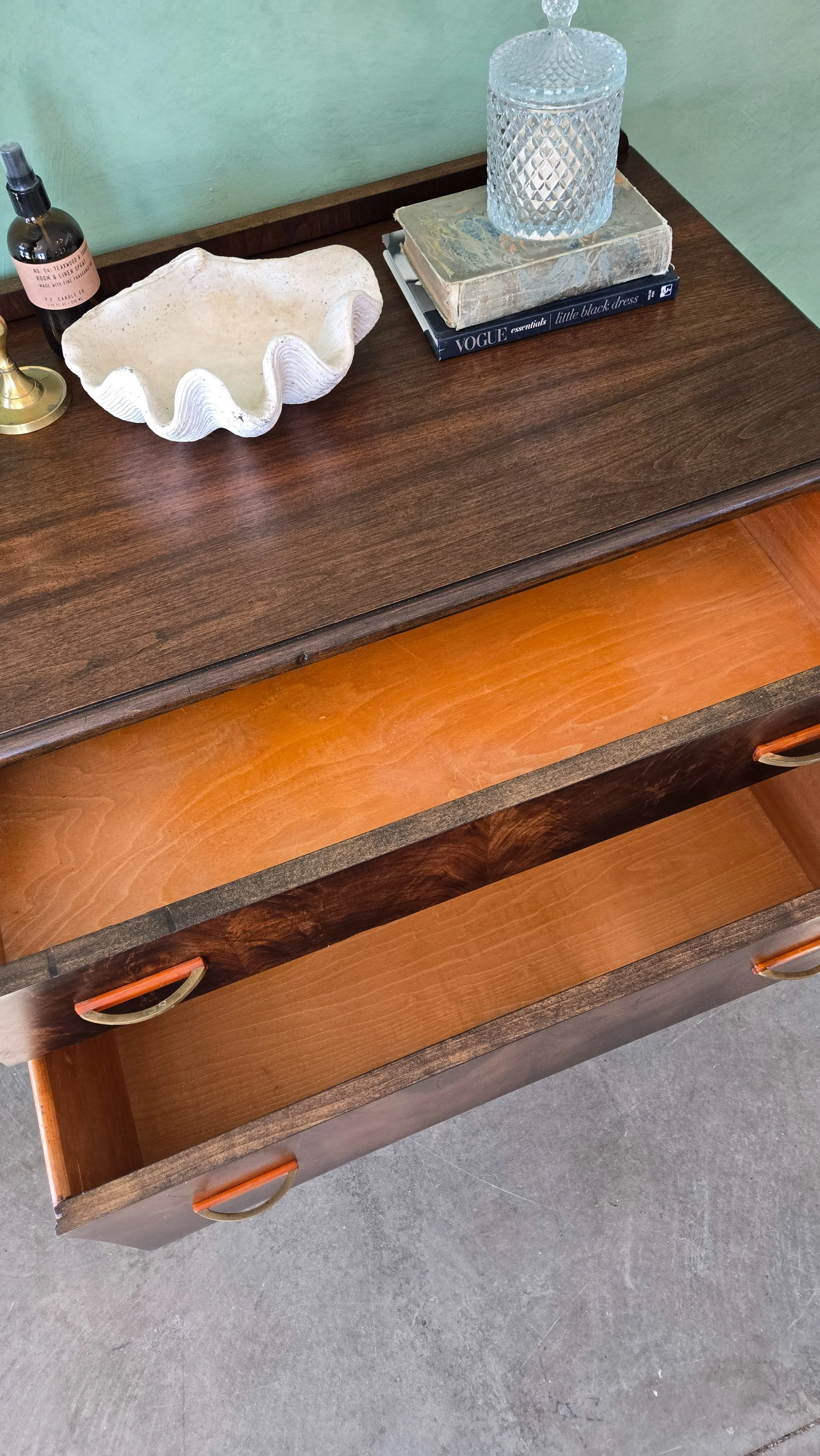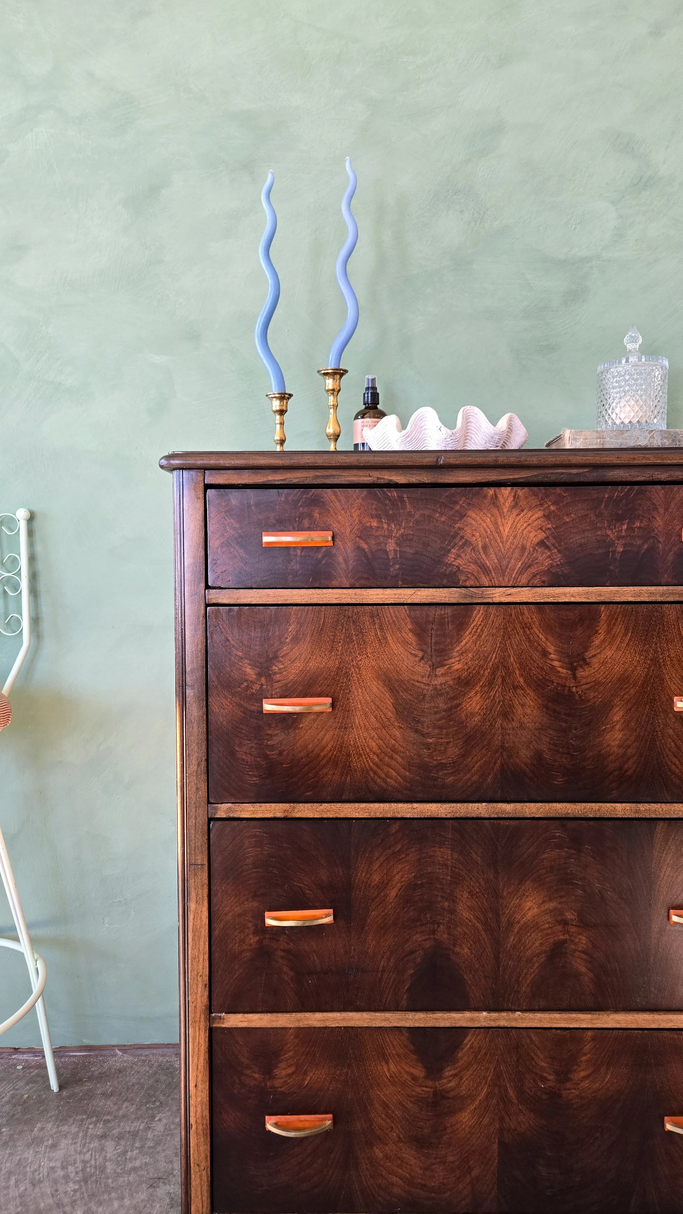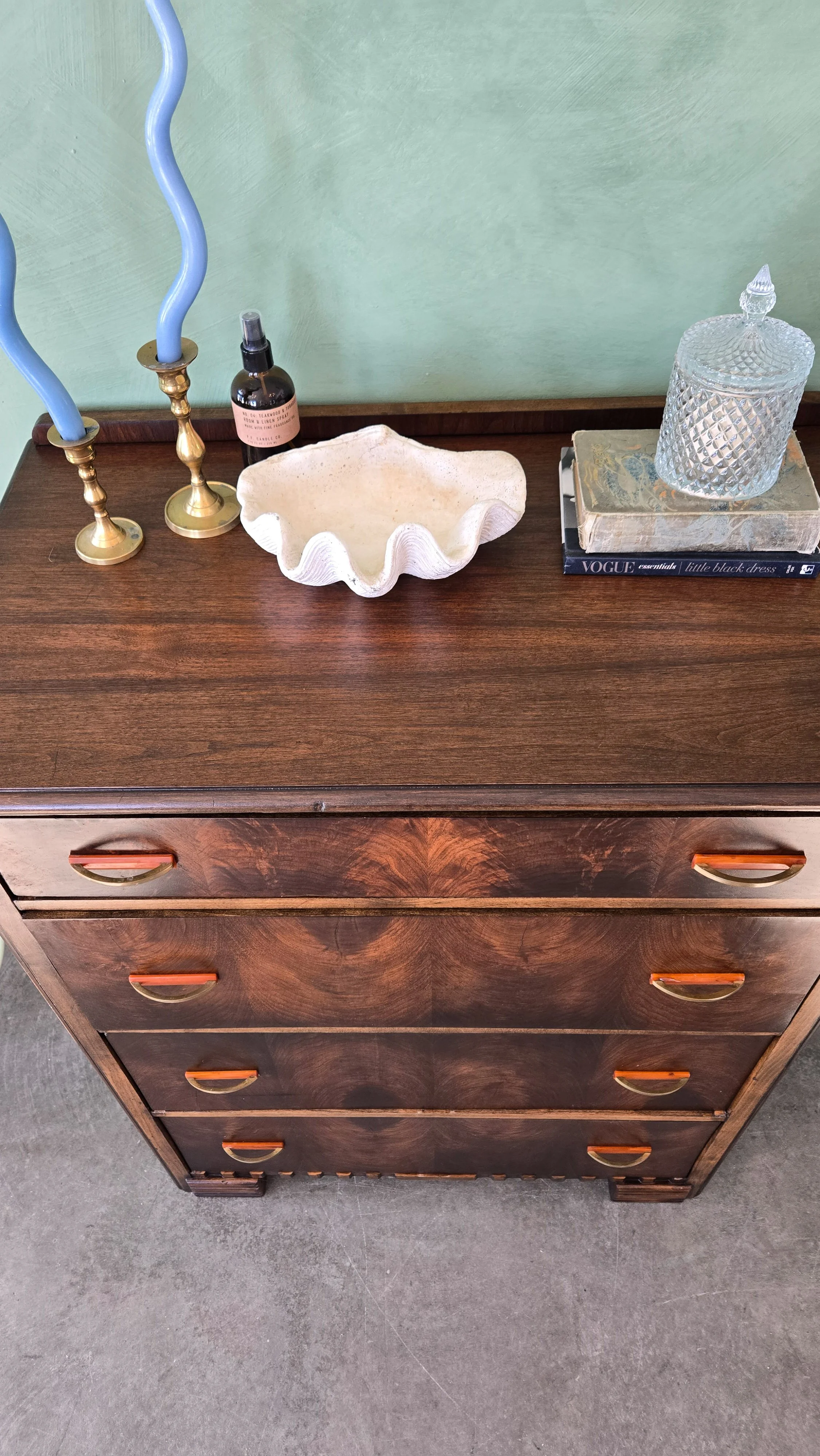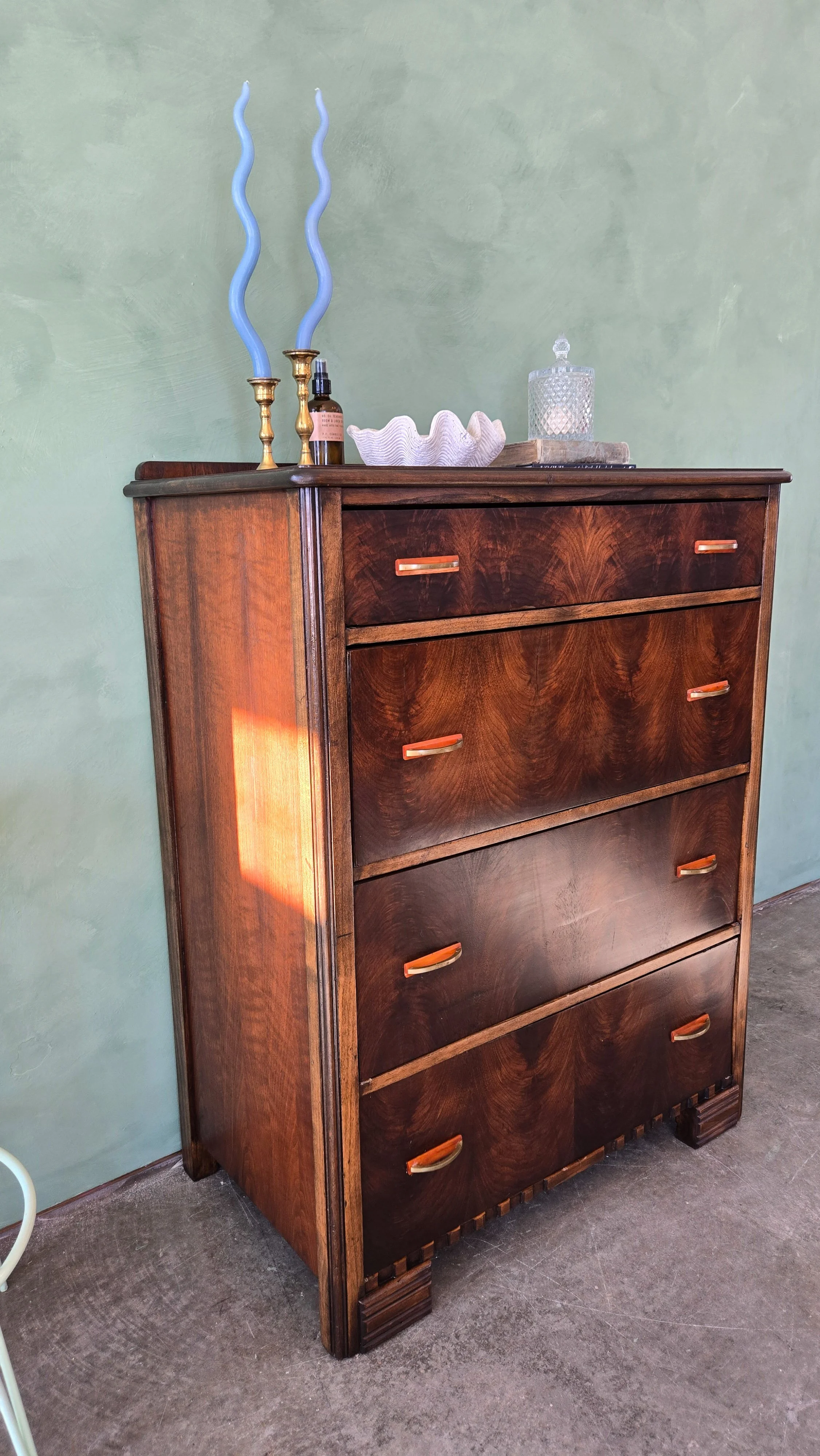 Beautiful late 1930s–1940s Art Deco dresser with walnut wood veneer and original Bakelite drawer pulls. Refinished to enhance the rich grain while preserving its vintage character.