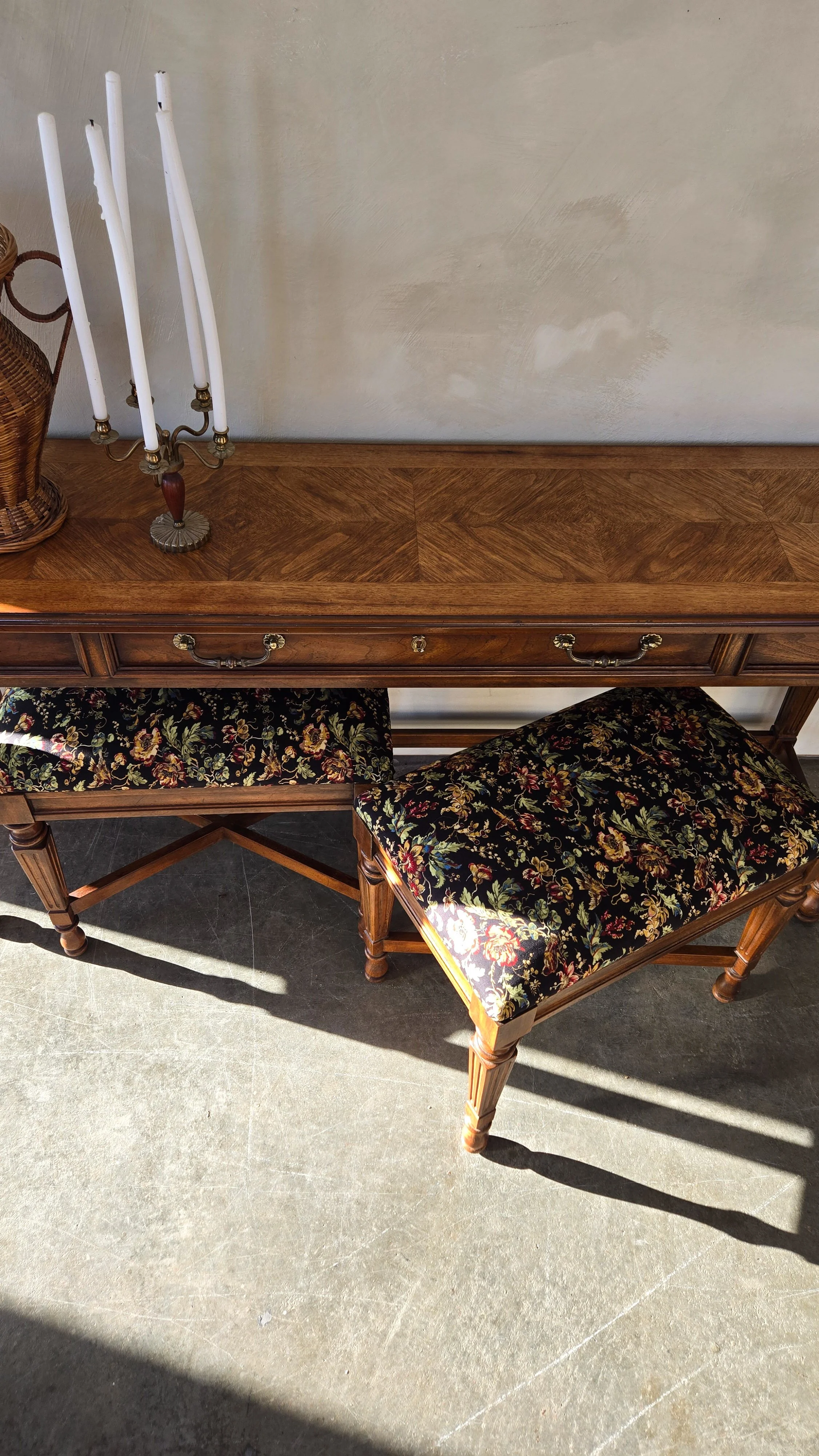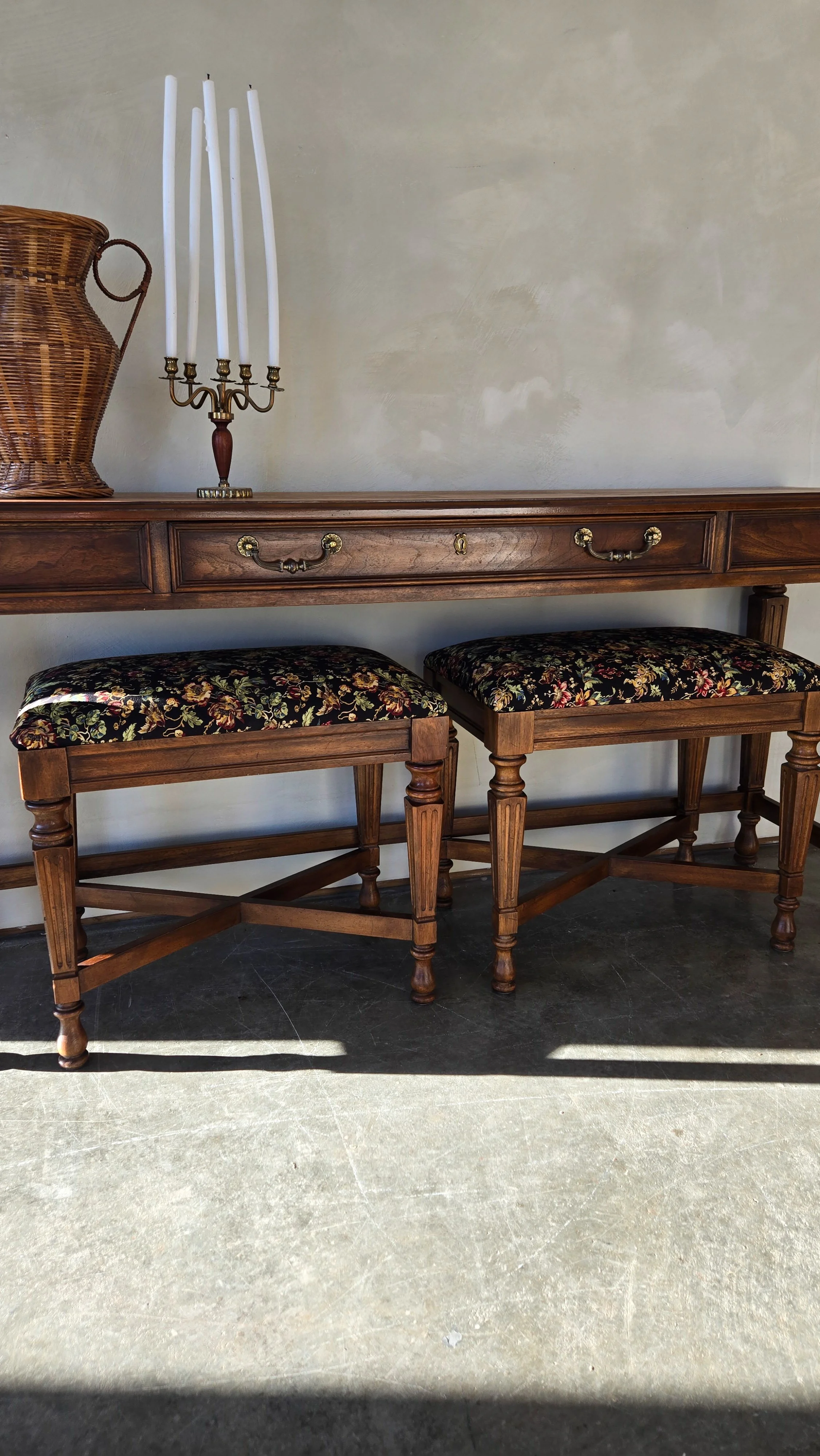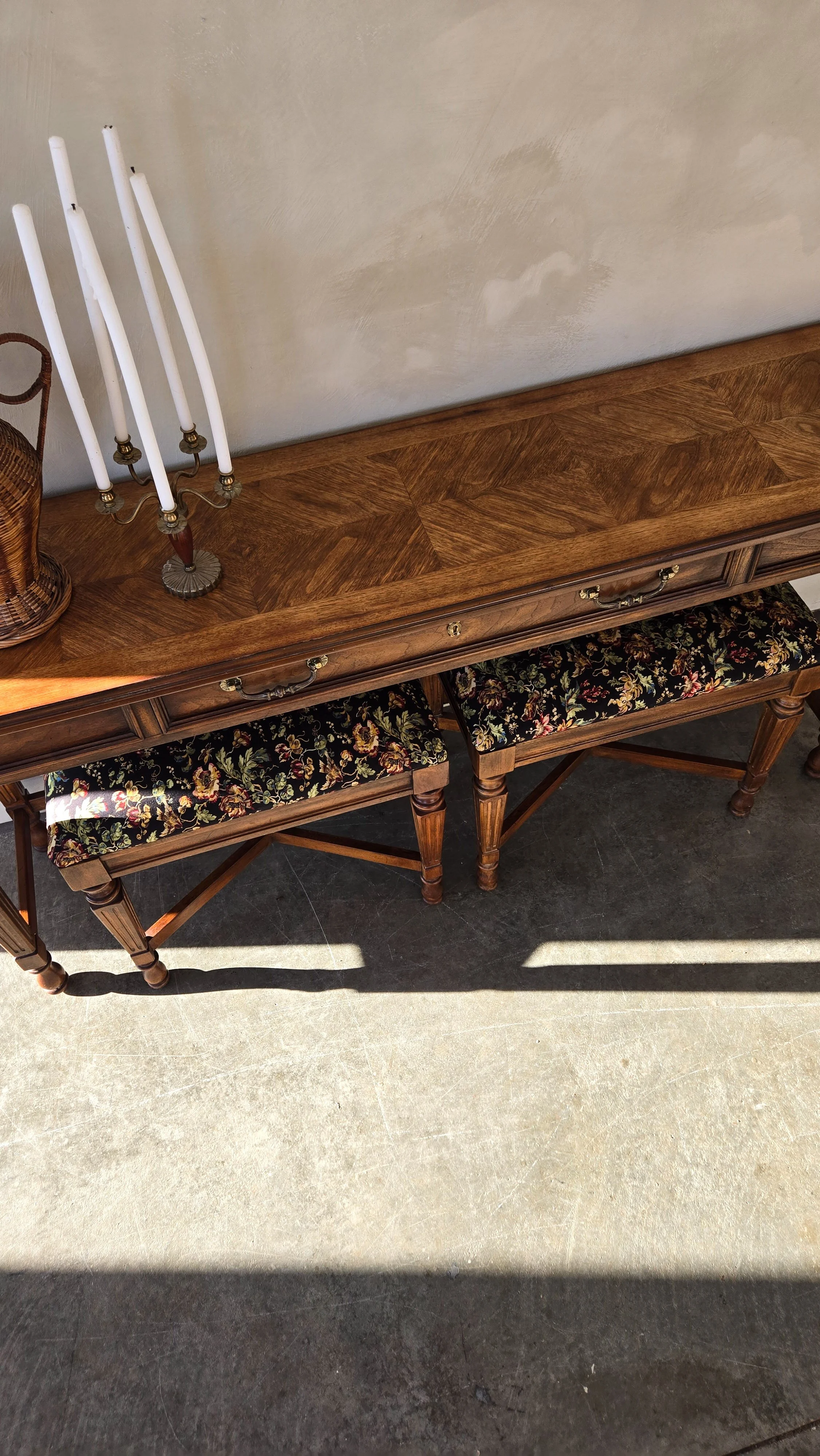 Made by Drexel solid wood vintage console & 2 matching benches. Very beautiful piece & quality made. Has a working drawer, lots of length on this piece & narrow - perfect for an entrance. Top has been refinished & new fabric for the benches. A timeless heirloom piece to add to your home.
