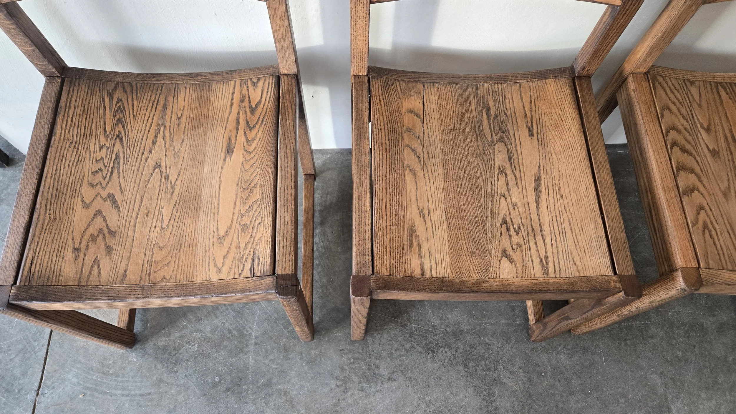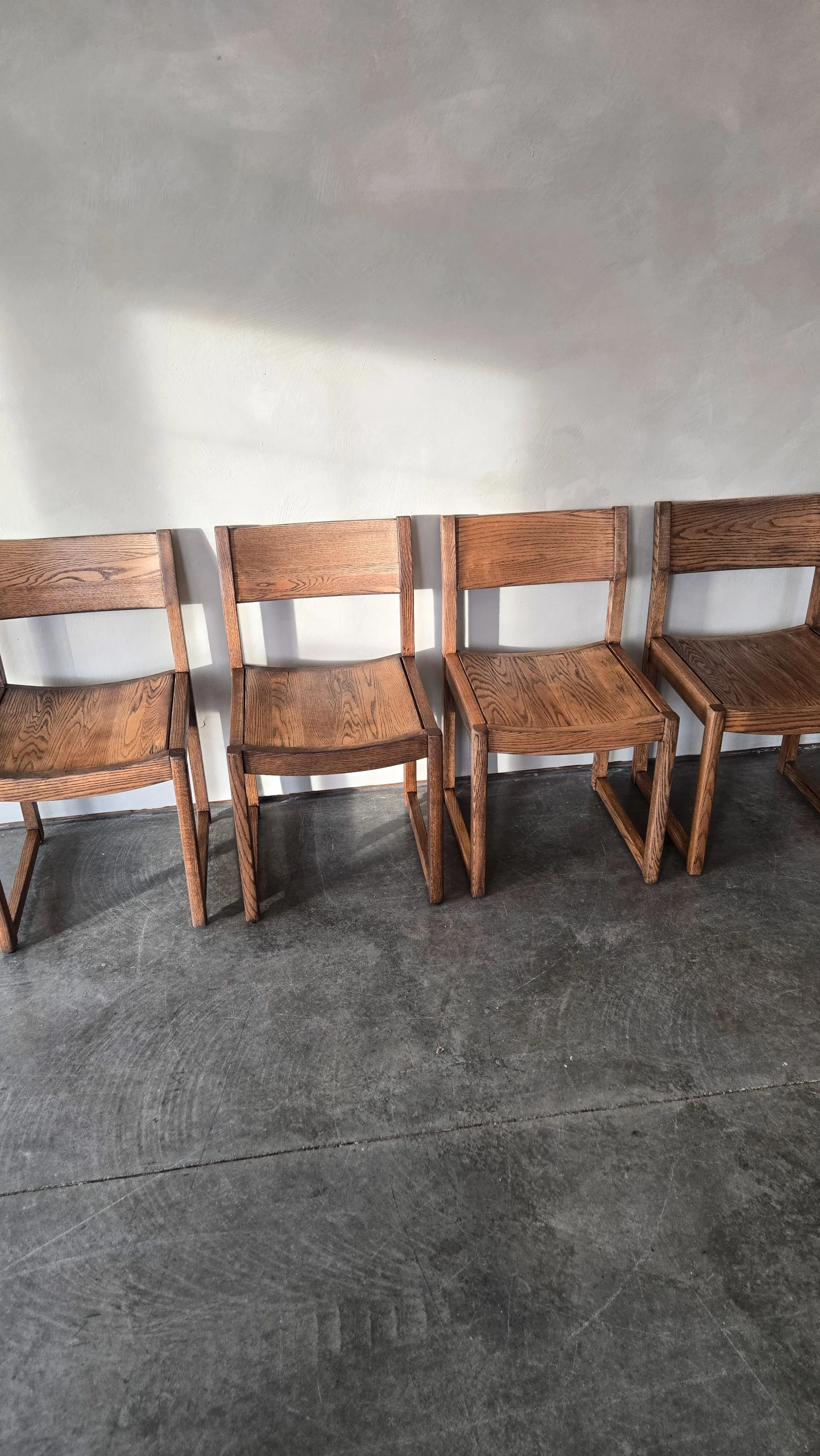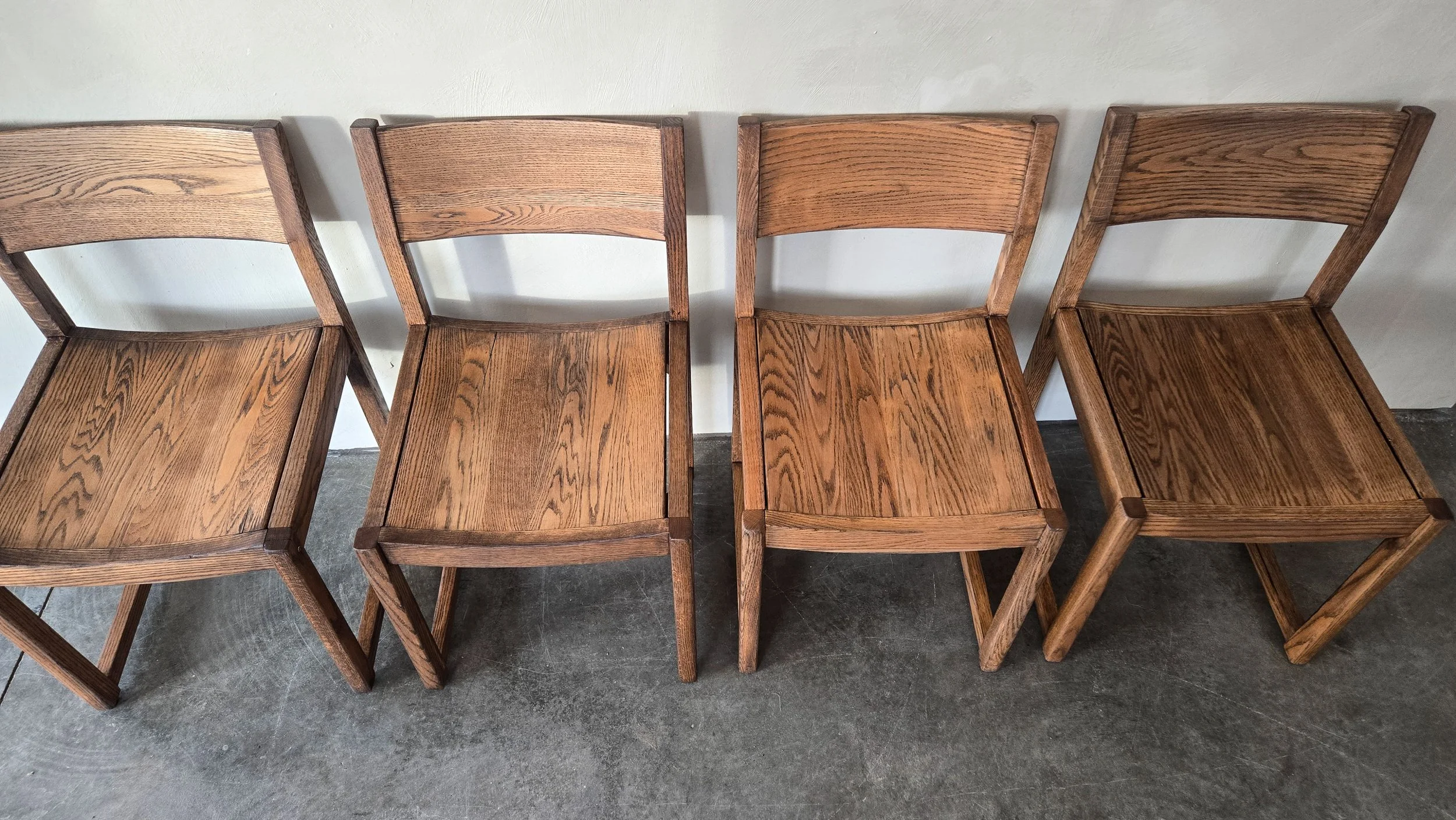 Set of 4 c.1970s cubed oak dining chairs. Very stylish & ergonomic shape on these & a beautiful wood tone.
