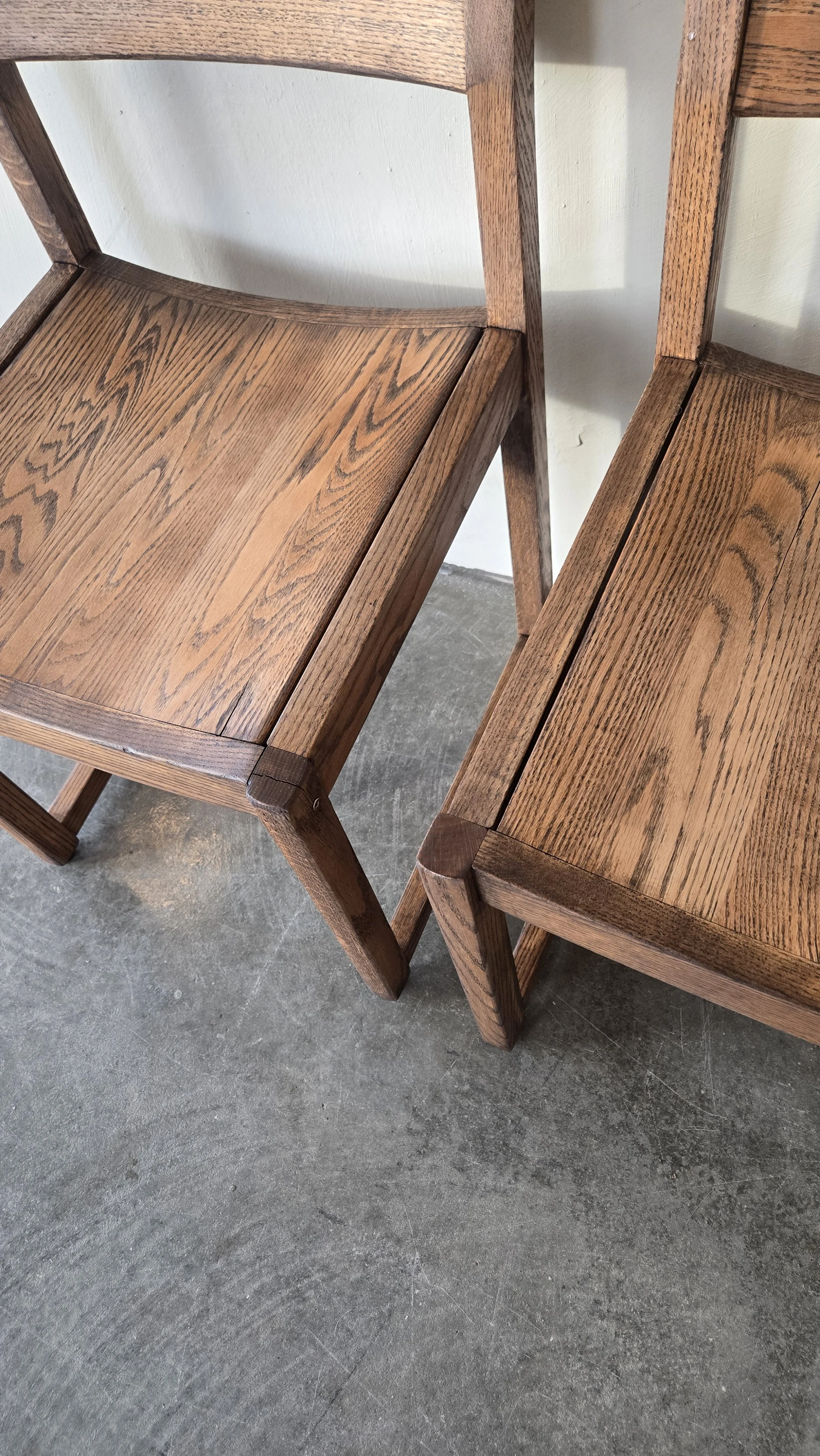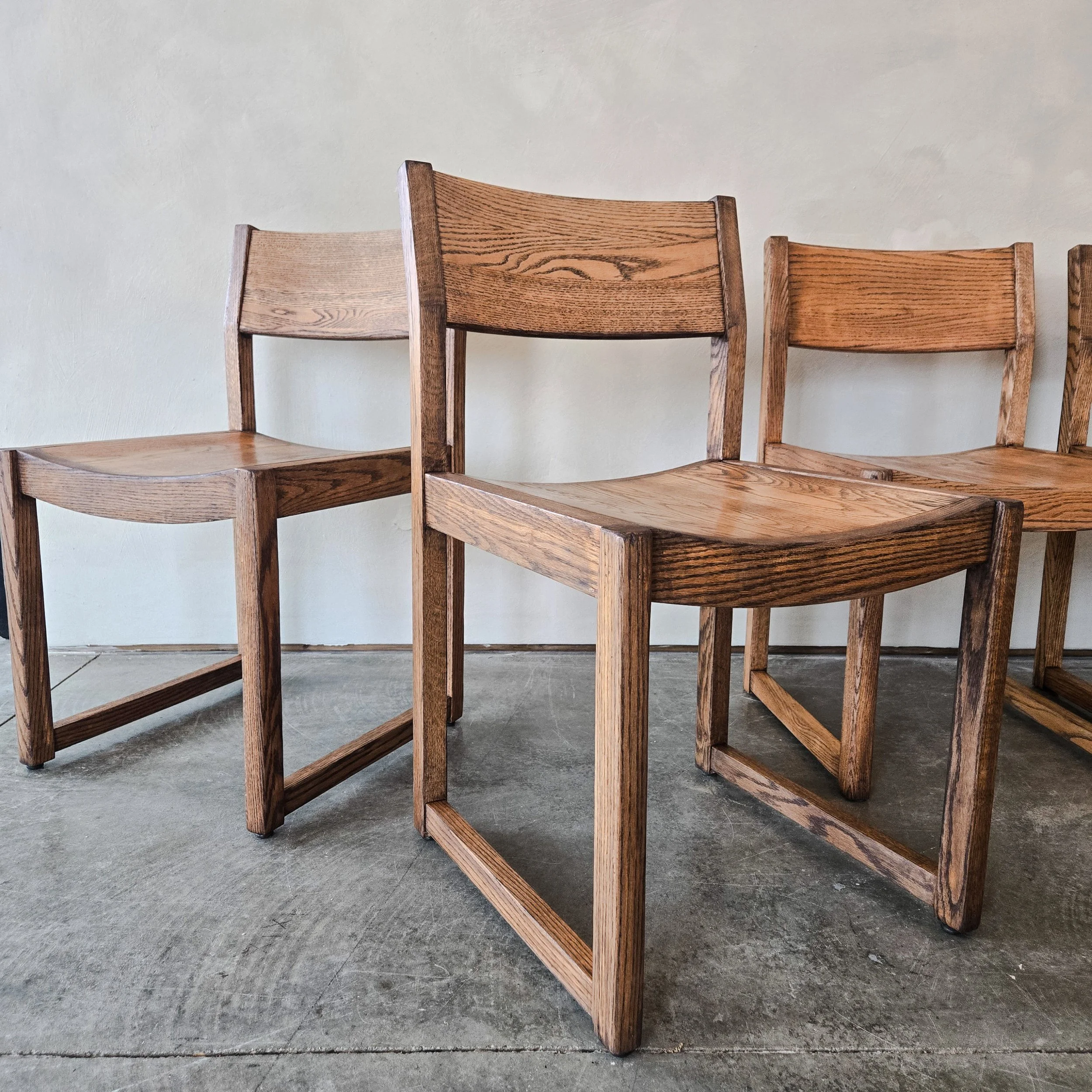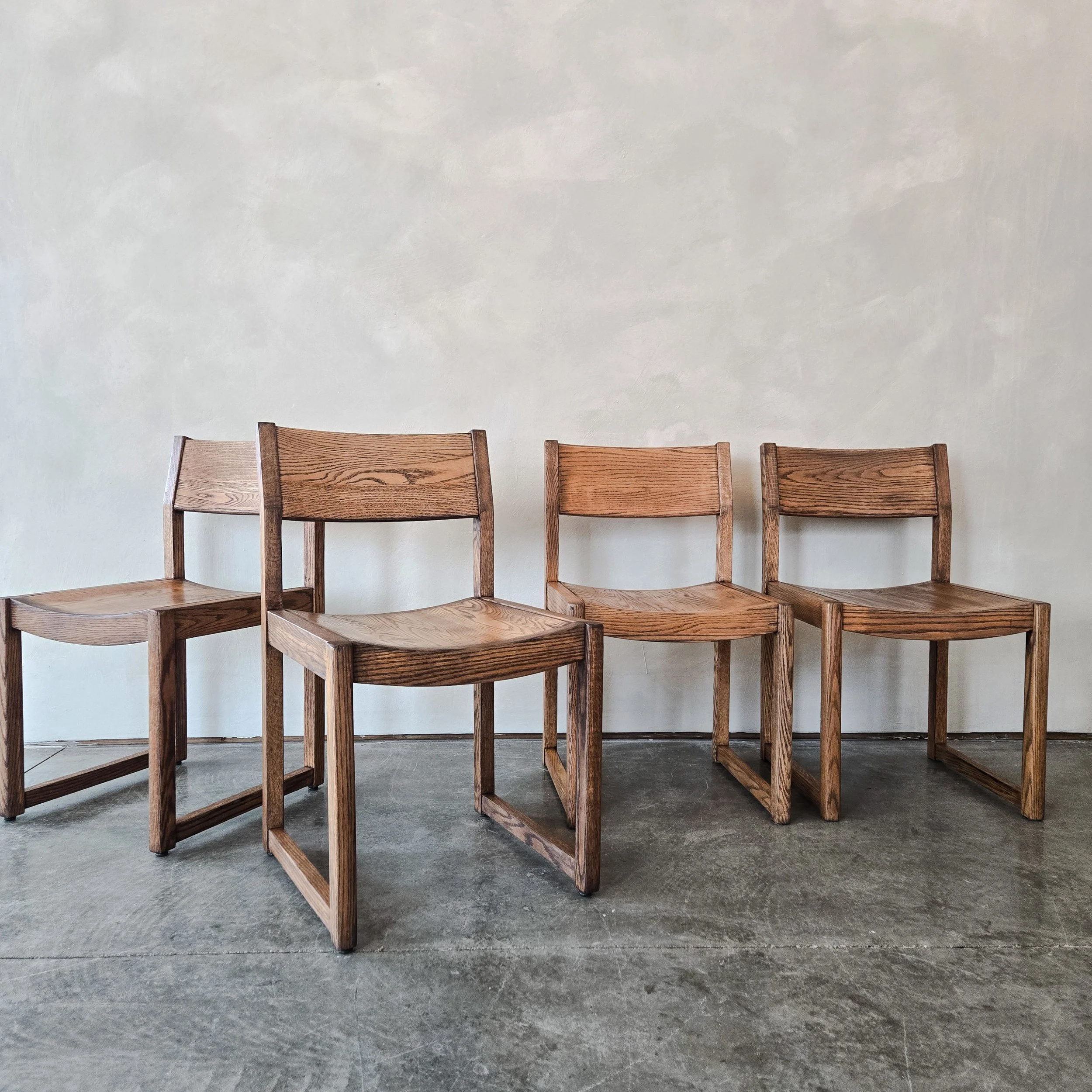 Set of 4 c.1970s cubed oak dining chairs. Very stylish & ergonomic shape on these & a beautiful wood tone.